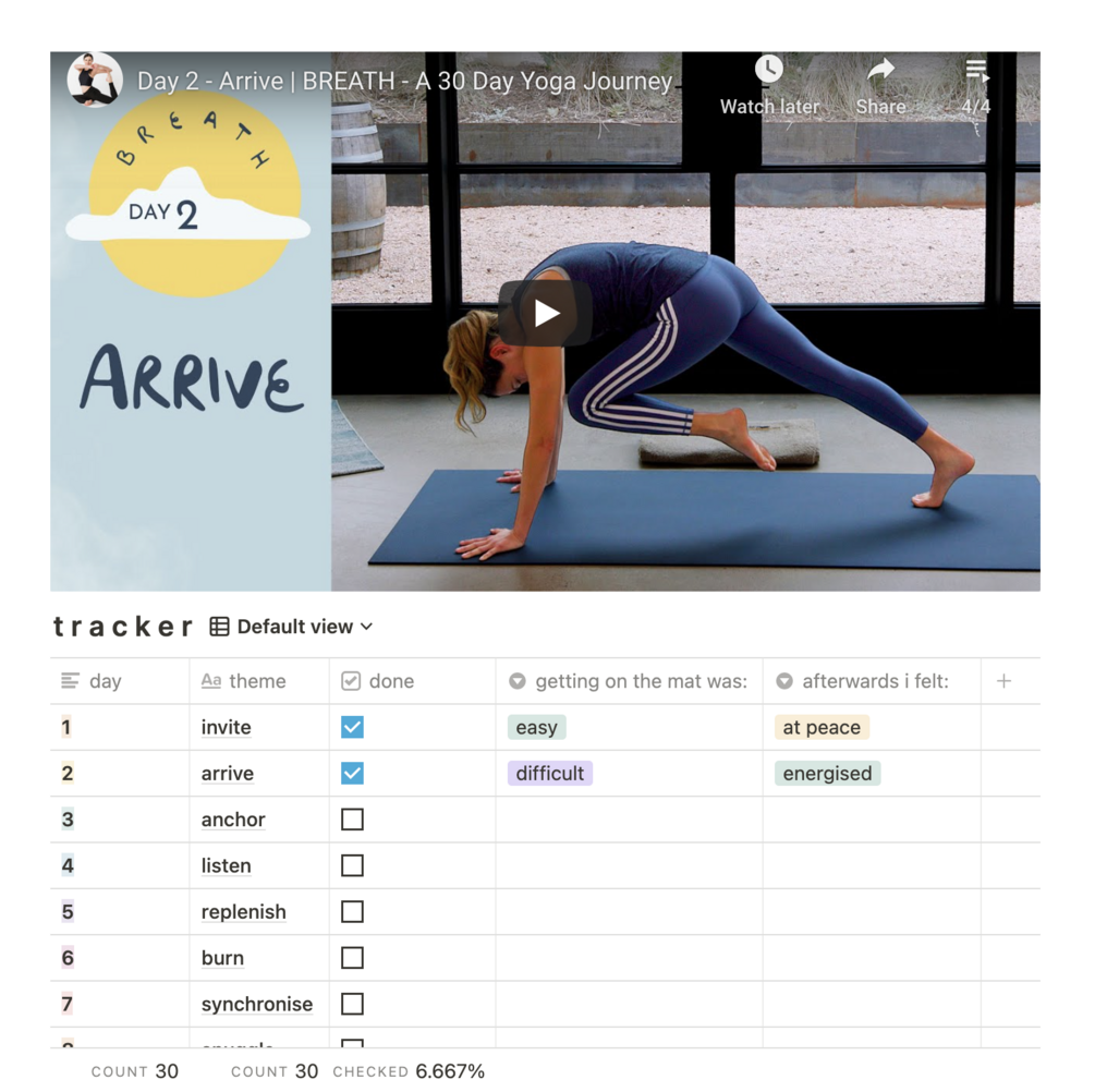 use this tracker to check off your 30 day yoga journey with Adriene. play the video for each day without leaving the page, and check off your progress and thoughts with the tracker database 🌿 namaste!